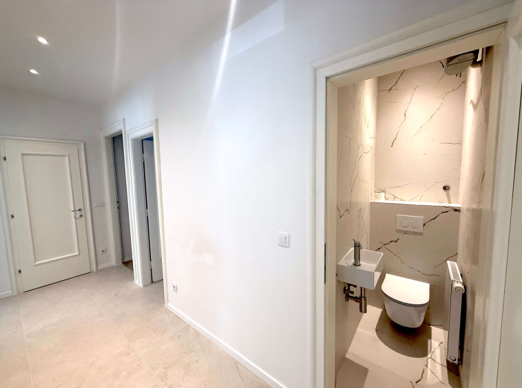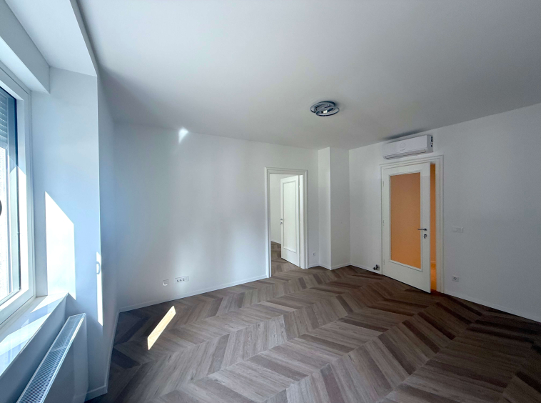 Stan se sastoji od ulaznog hodnika, dvije velike prostrane sobe i jedne manje sobe, kuhinje sa blagovaonicom, jedne velike kupaonice sa tuš kabinom te dodatnog gostinskog toaleta. Stan je kompletno renoviran 2025-te godine izmjenjene su sve cijevi i instalacije, te instalirane potpuno nove sanitarije, kuhinja, sva vrata, rasvijeta, električni podizači roleta, itd. Iznajmljuje se nenamješten te je pogodan za ”tihe” djelatnosti poput odvjetničkog ili javnobilježničkog ureda… parking je javni u okruženju stambene zgrade.