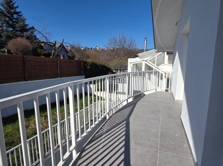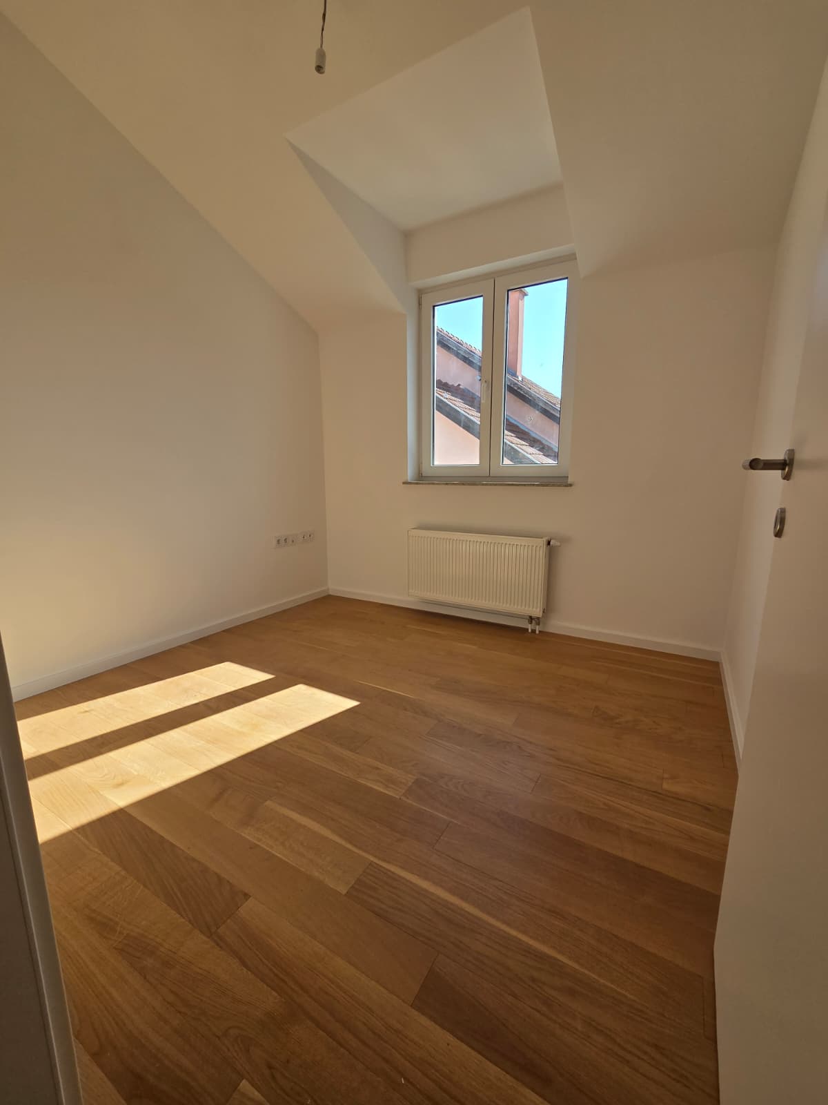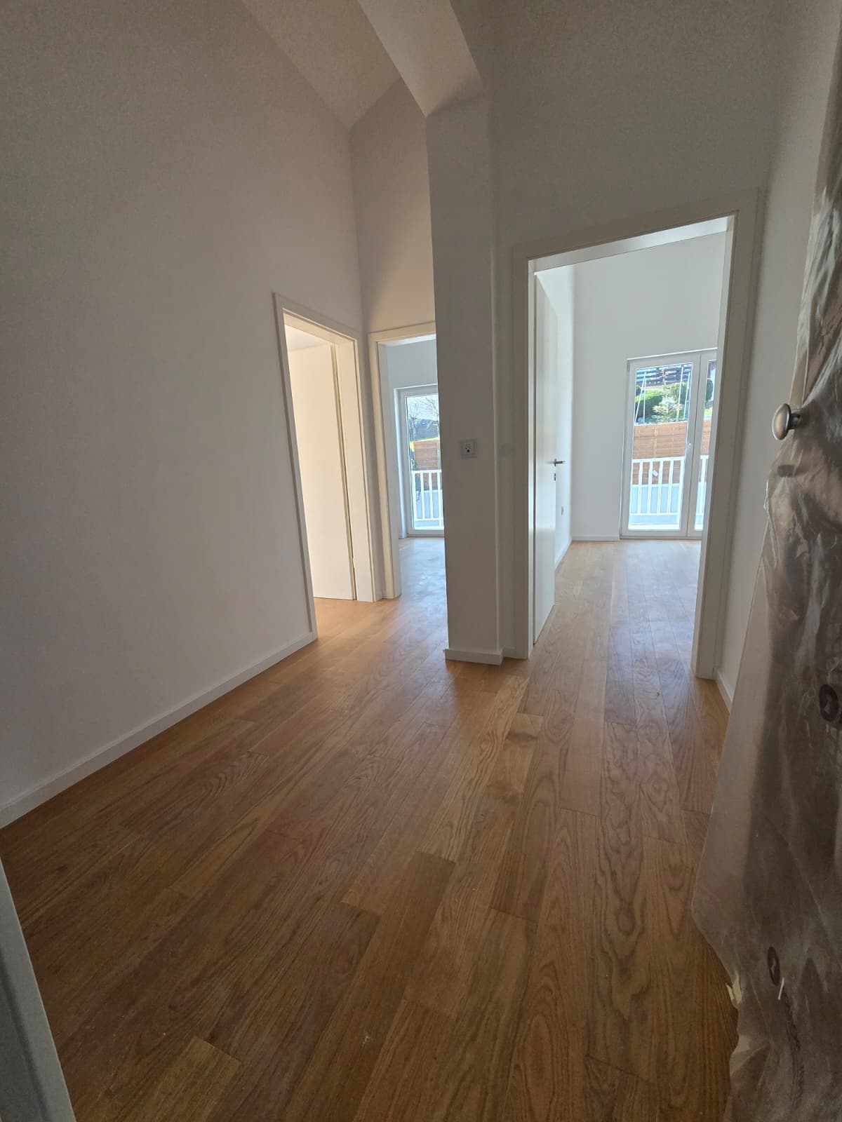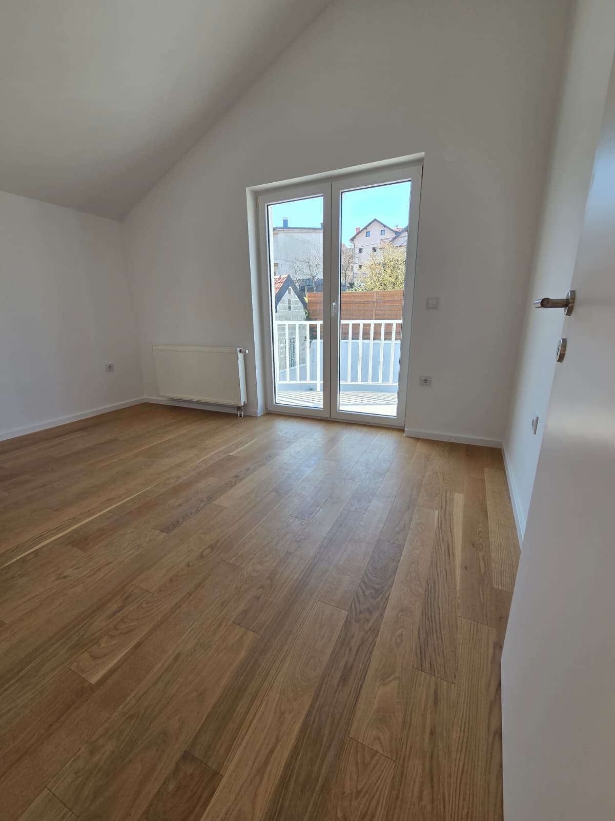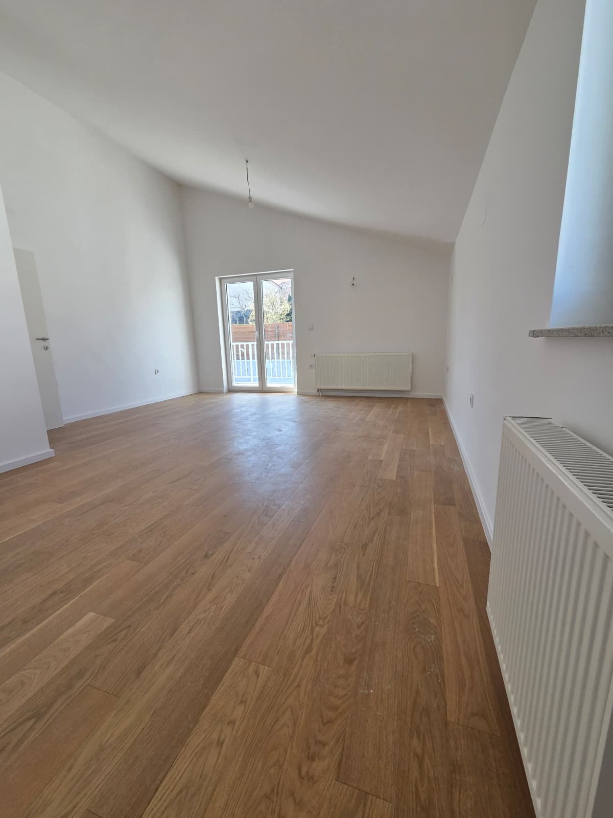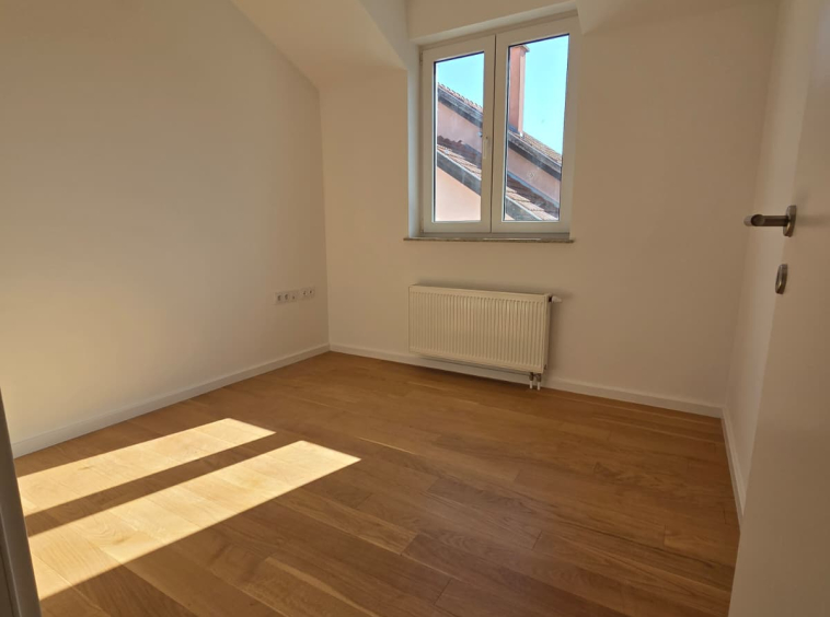 Trosoban stan sa balkonom. Stan se sastoji od dvije sobe manje sobe i jednom većom, koja je predviđena kao dnevni boravak sa kuhinjom.